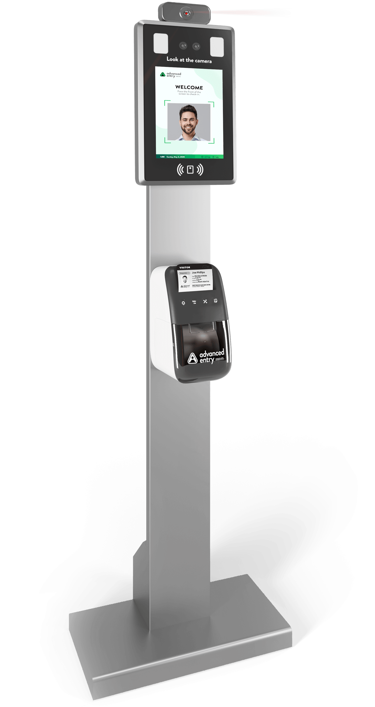 - All-in-one device: includes a facial recognition camera, thermometer, QR code reader, and ID reader